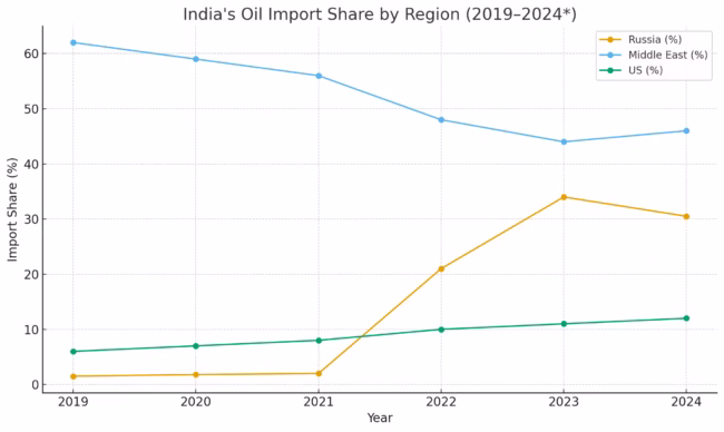 India currently imports over 30–34% of its crude from Russia (2023–24 average).